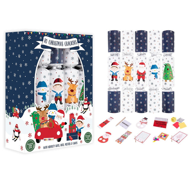 This pack of ten family crackers is a fun and engaging item for Christmas, featuring a Santa & Friends design printed on blue or white base and finished with white curling ribbon. These family crackers contain a hat, motto, snap and gift.