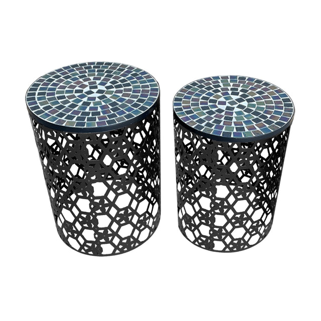 This exceptional product features a pair of tables, perfect for both indoor and outdoor use. The breath-taking tiled mosaic top, in a striking iridescent design, is held up by sturdy black metal framework.