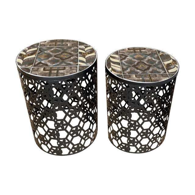 This exceptional product features a pair of tables, perfect for both indoor and outdoor use. The breath-taking tiled mosaic top, in a striking blue and grey geometric design, is held up by sturdy black metal framework.