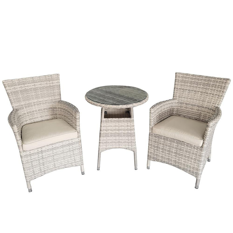 The Capri 2 Seater Round Bistro Set - 60cm in stylish grey rattan offers bistro style dining for two people. This set is made from the highest quality weather and water-resistant polyethylene wicker, woven around a powder-coated aluminium frame. This set comes complete with deep seat cushions and a 5mm tempered glass table top.