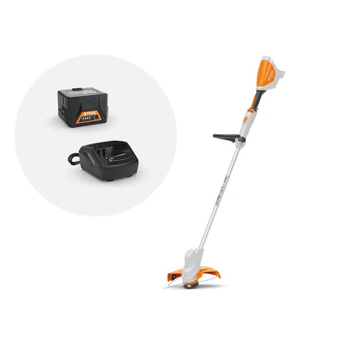 Cordless brushcutter with very high-performance mowing for grass trimming and clearing work. Cutting circle diameter of 280 mm, soft grip, adjustable loop handle, the mowing line automatically readjusts when the mowing head is tapped on the ground. Quiet, no ear protection needed. Comes with AK 10 battery and AL 101 charger as standard.