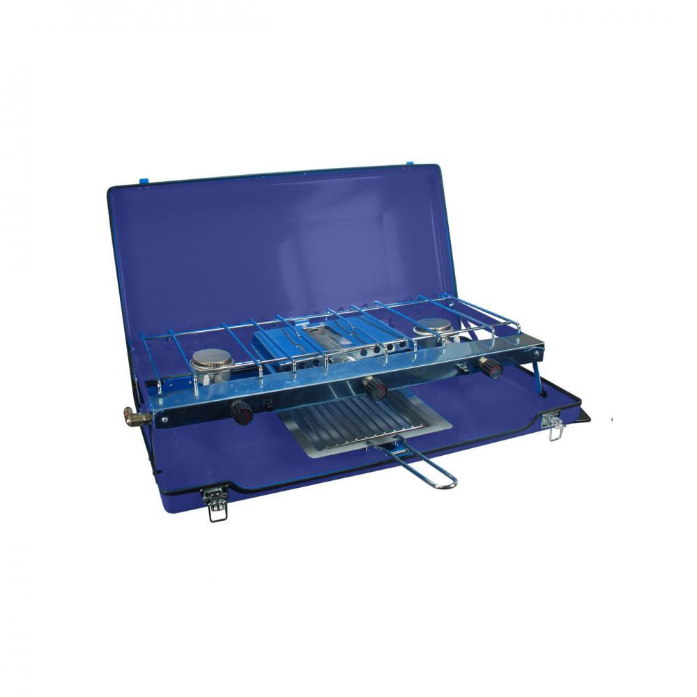 Double burner portable camping stove and grill. Features 3 burners - 2 for pans and 1 central grill. Includes toast rack pan with handle.