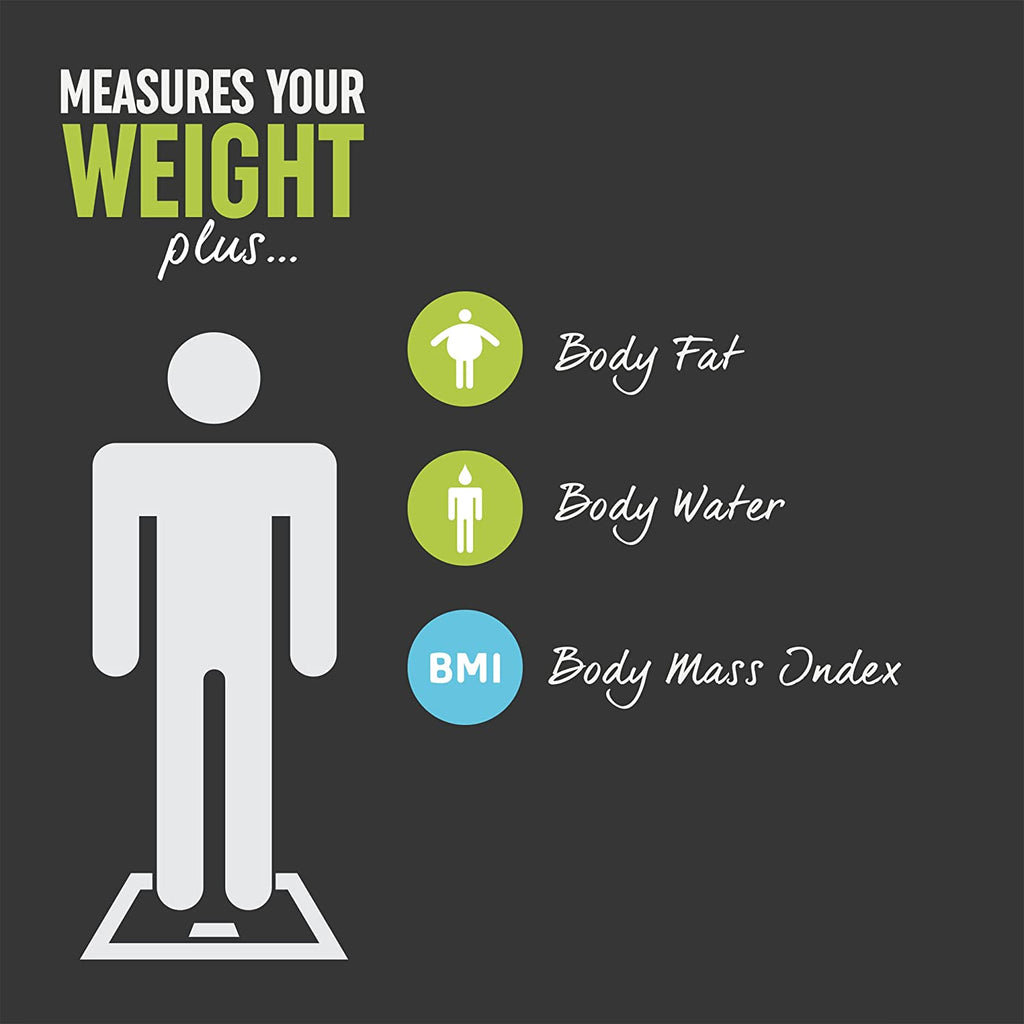 - Measures your weight plus: body fat, body water and Body Mass Index