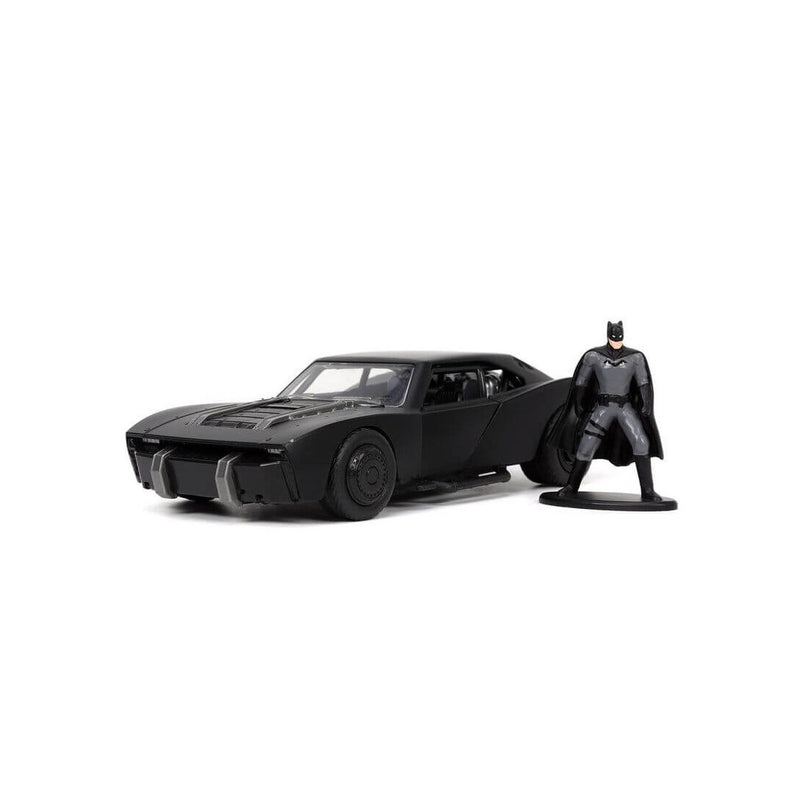 1:32 scale diecast Batmobile model with Batman figure Sleek matte black exterior with opening doors and freewheel technology Die-Cast model ensures a high level of detail without compromising quality Part of the DC Comics collection from Jada Toys Ships in a display box for safe keeping 3.5"L x 8"W x 3"H