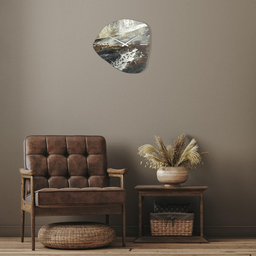 Introducing Mineral, a 14-inch dial. The composition of this clock adopts the deep shades found in natural rock formations. A kaleidoscope of mocha, charcoal, limestone and gold fleck sweep over a mirrored face. White hands and ticks captivate the eye. A unique feature for a lounge, a dining area, or a hallway.