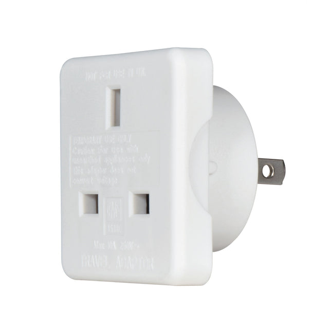 Mains adaptor to allow devices fitted with UK mains plugs to be used in The USA. Note: this is purely a socket adaptor - you must ensure your device is suitable for the local voltage.